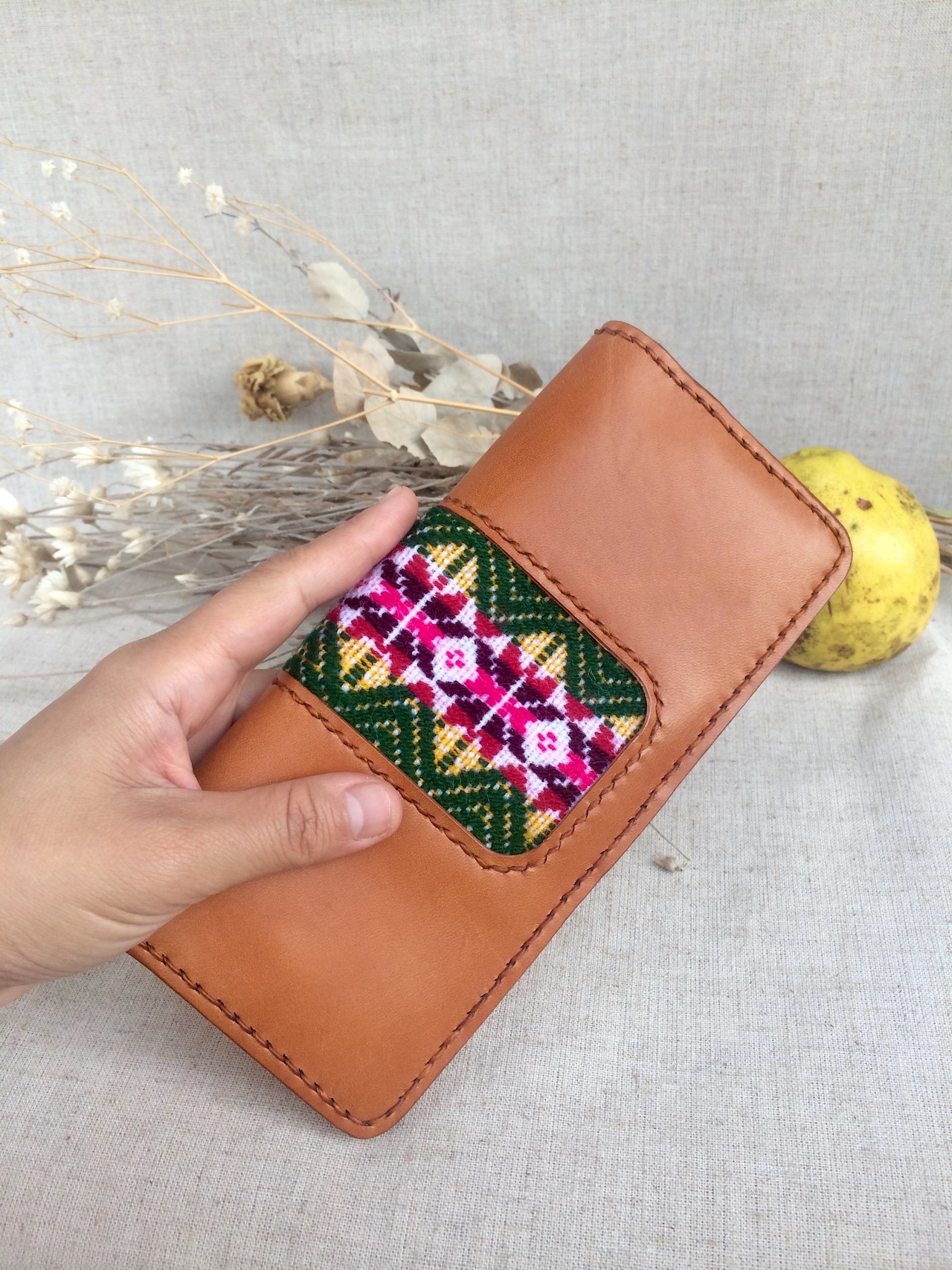 キャメルカラーの綺麗な牛革に、カラフルなグァテマラ織りを組み合わせ 温かみのあるレザーロングウォレットに仕上がりました✴︎ハンドステッチ独特の優しい雰囲気と強度があります。