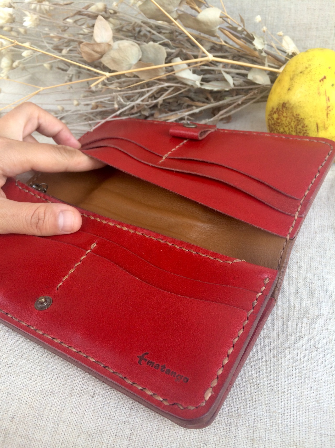 ワインレッドの上品な牛革に、グアテマラのカラフルなラグ を組み合わせ 温かみのあるレザーロングウォレットに仕上がりました✴︎