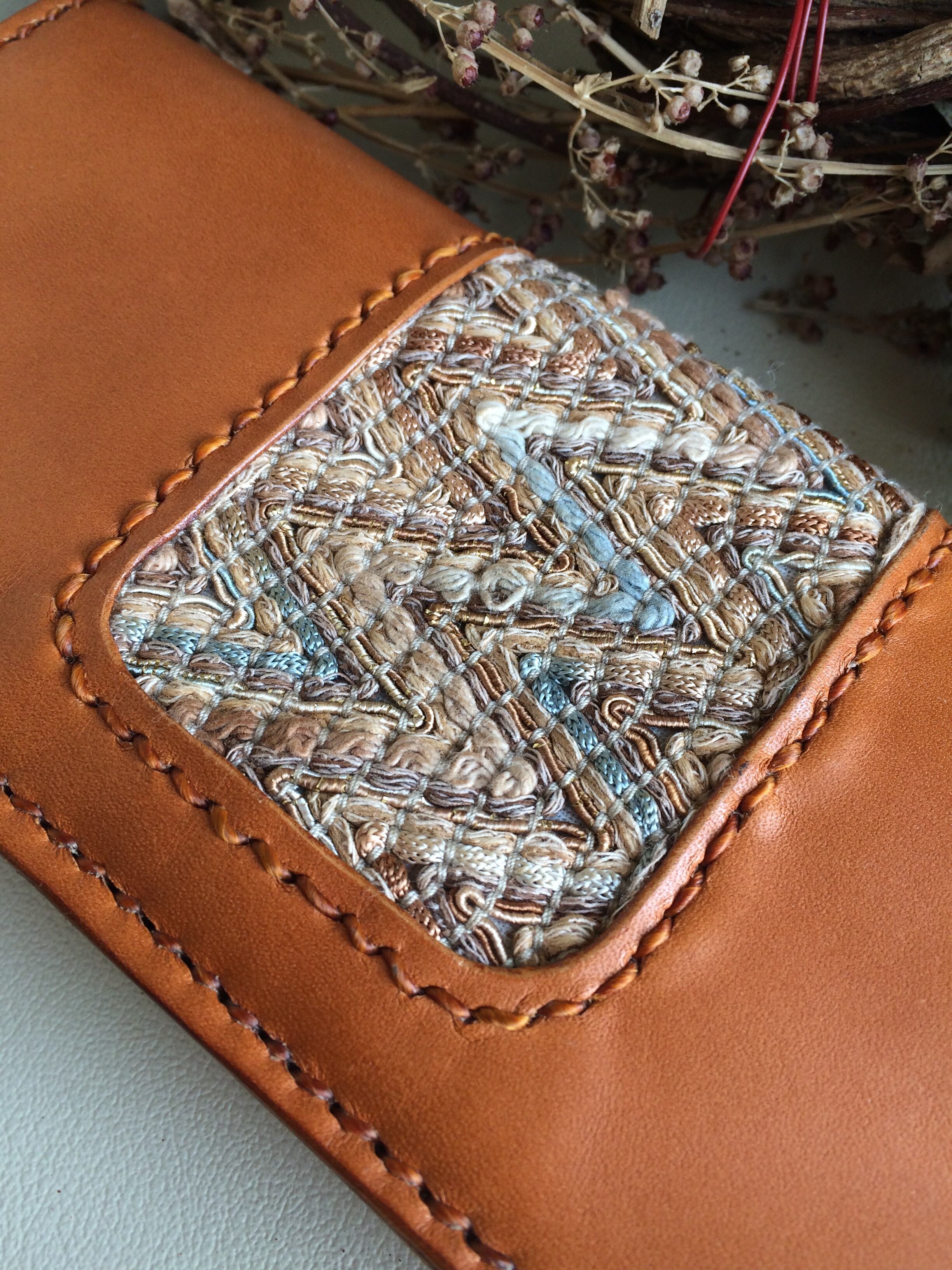 ウィスキーカラーの綺麗な牛革にイタリアから来た、金糸を織り込んだ爽やかなアースカラーのヴィンテージ リボンを組み合わせた Matango!〜leatherworks〜オリジナルのロングウォレットです。