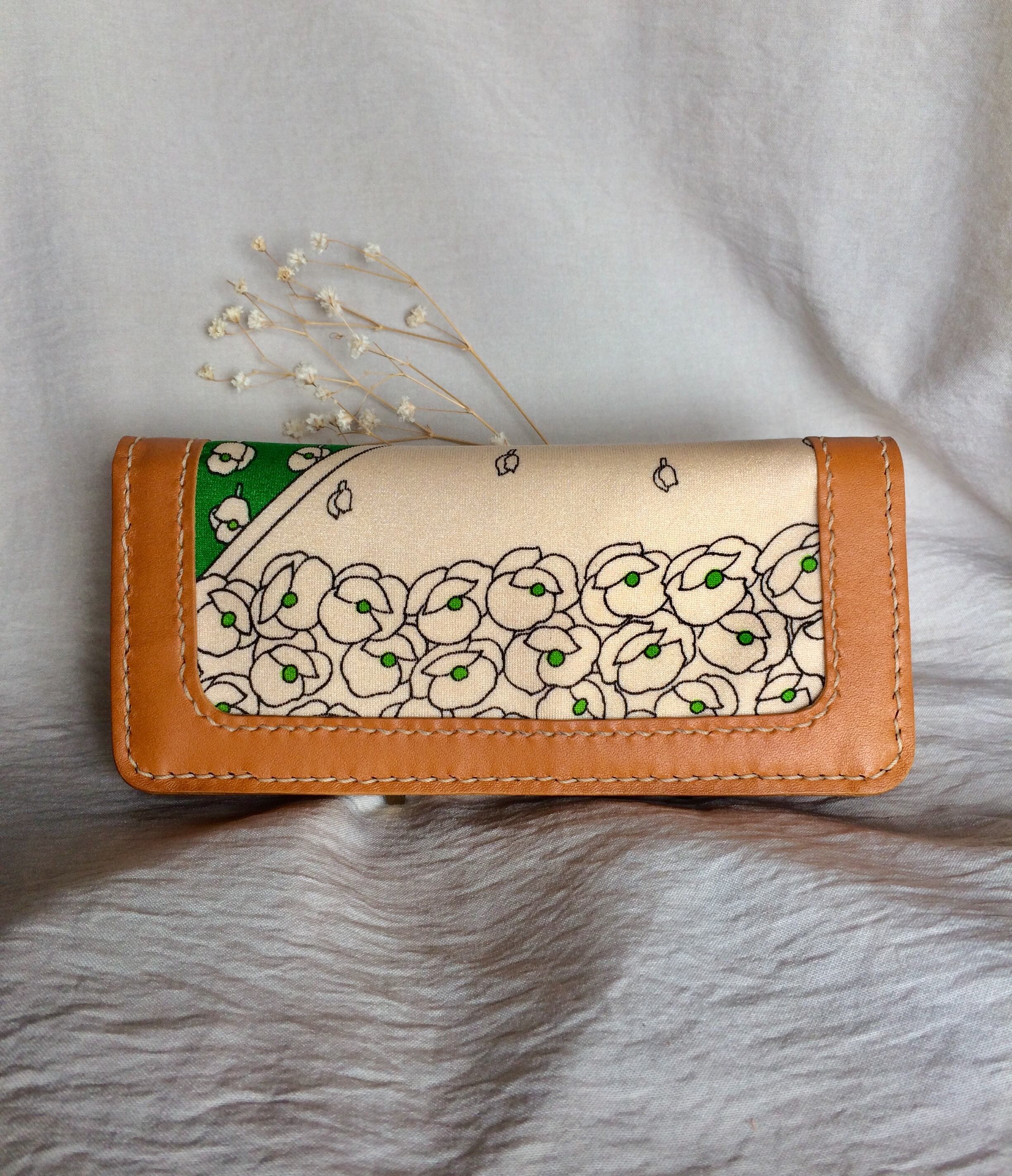 ウィスキーカラーの綺麗な牛革に、緑と白いお花がレトロで可愛らしい80年代国産のデッドストック生地と、これまたデッドストック の赤いキッチュなボタンを組み合わせたMatango! leatherworks.オリジナルのレザーロングウォレットです。